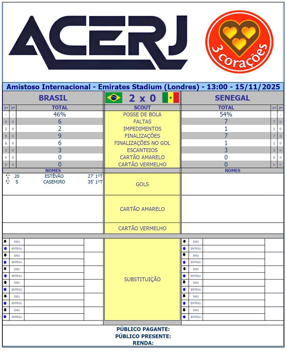Scout do 1º Tempo de Brasil e Senegal em jogo amistoso de preparação para a Copa do Mundo de 2026 no Emirates Stadium em Londres #Acerjinforma #BRAxSEN @CBF_Futebol