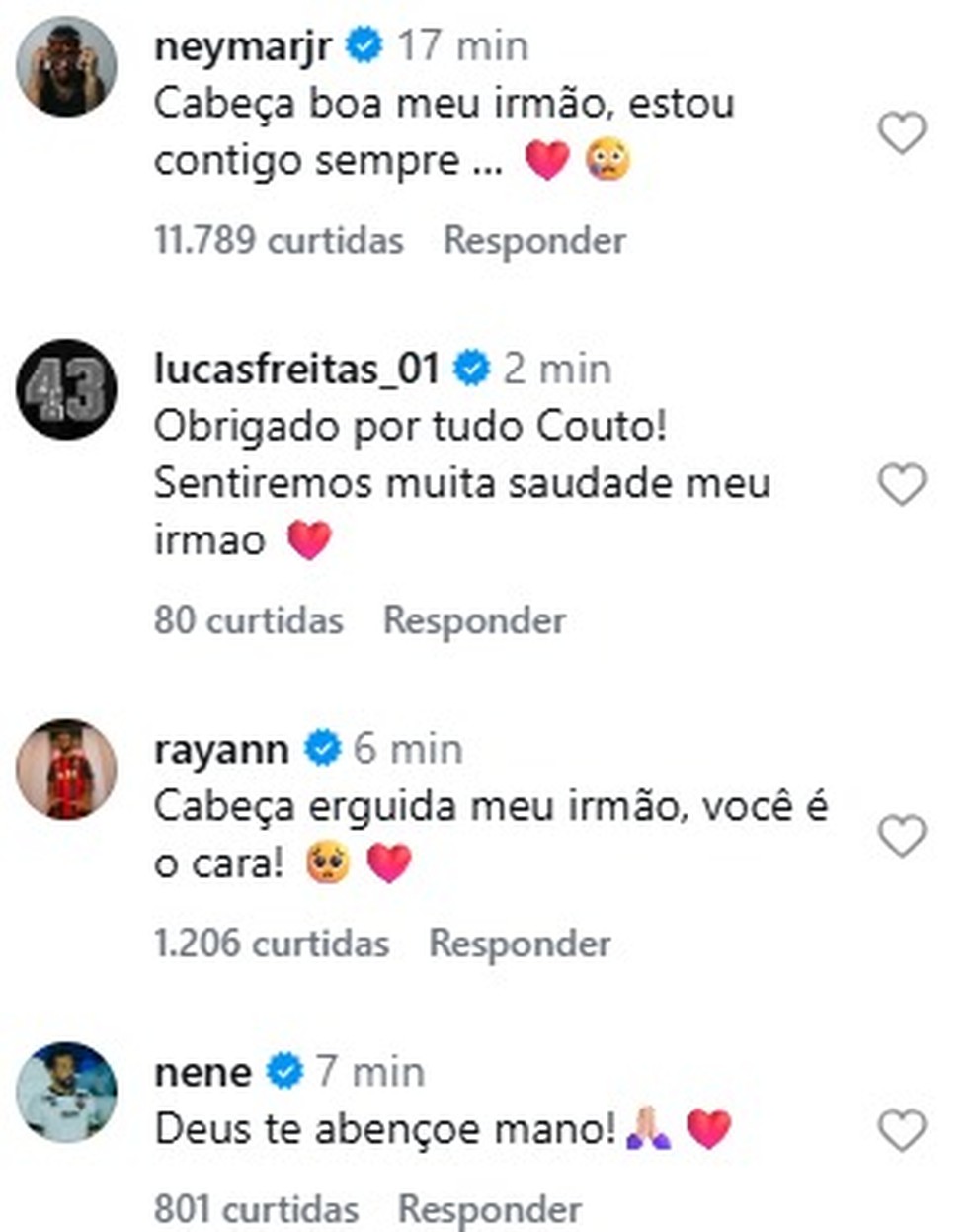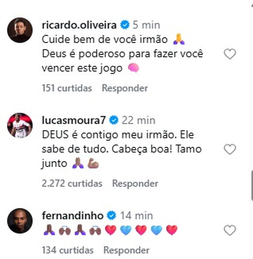 Familiares, jogadores do Vasco e personalidades famosas também comentaram na publicação. Os zagueiros Robert Renan e Lucas Freitas foram os primeiros jogadores do atual elenco a mandarem mensagem para o atleta. Lucas Leiva, Dedé e Souza, ex-jogadores, também mandaram mensagens.