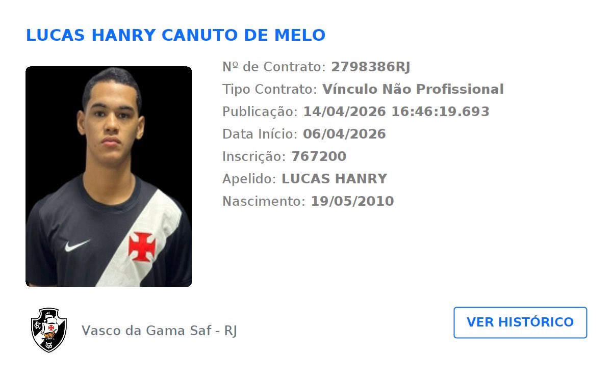 O Vasco acertou a contratação do volante Lucas Hanry, ex-Sport, para o Sub-17.