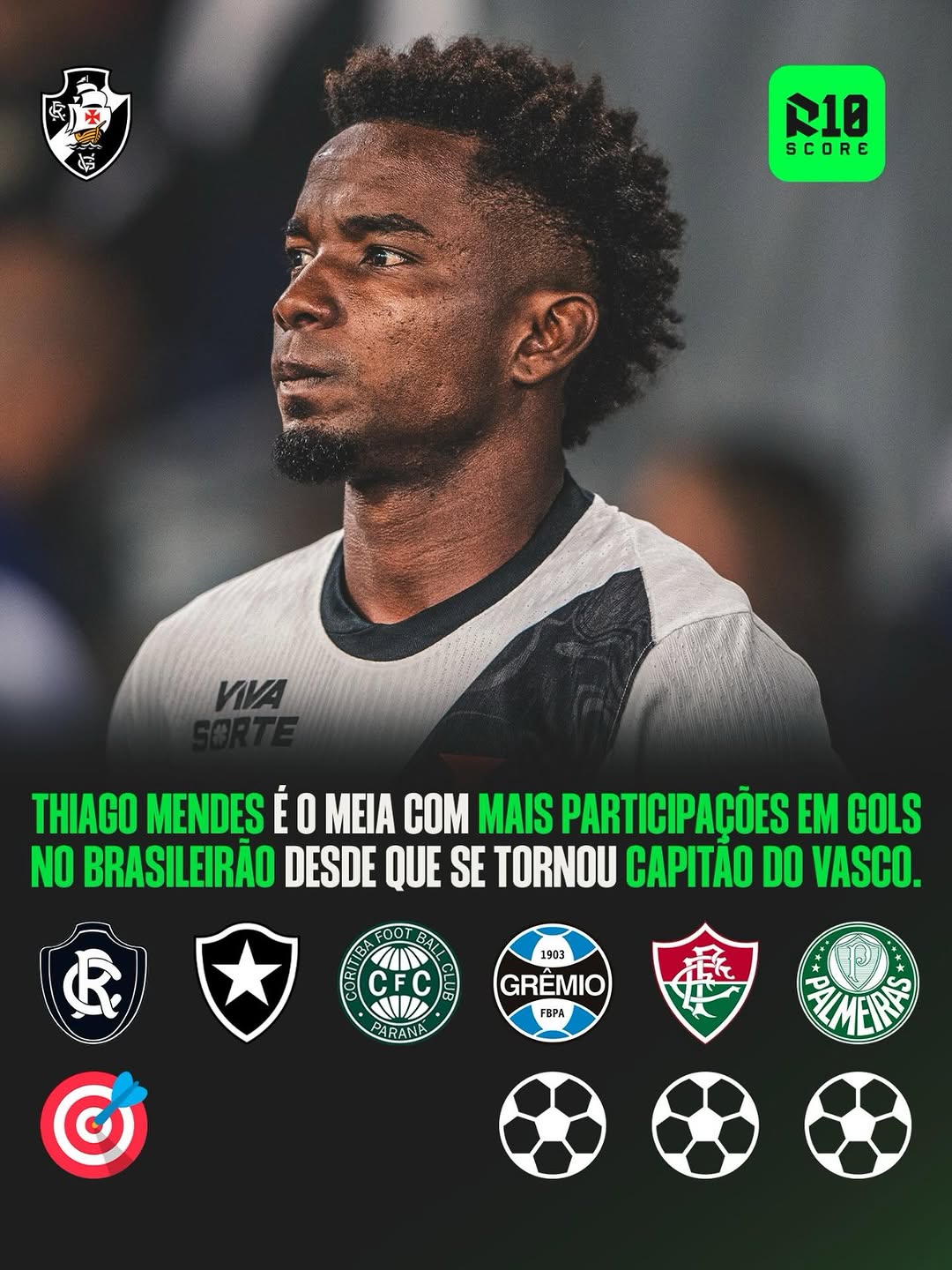 HONRANDO A BRAÇADEIRA! Thiago Mendes é o meio-campista com mais participações em gols na Série A desde que se tornou capitão do Vasco.