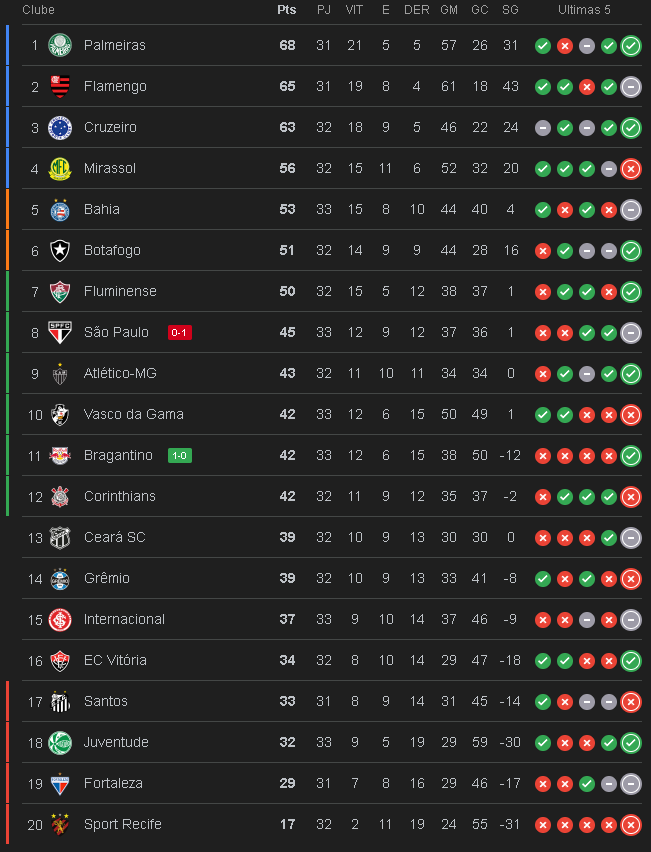 Quatro jogos abriram a 33ª rodada do Campeonato Brasileiro neste sábado. O Vasco, que perdeu para o Juventude em São Januário, está em 10º lugar.