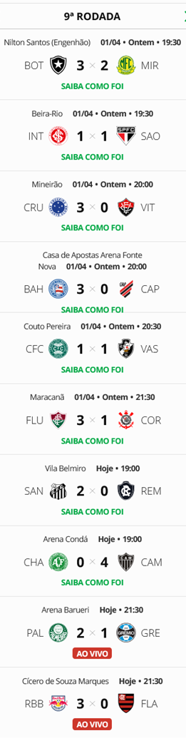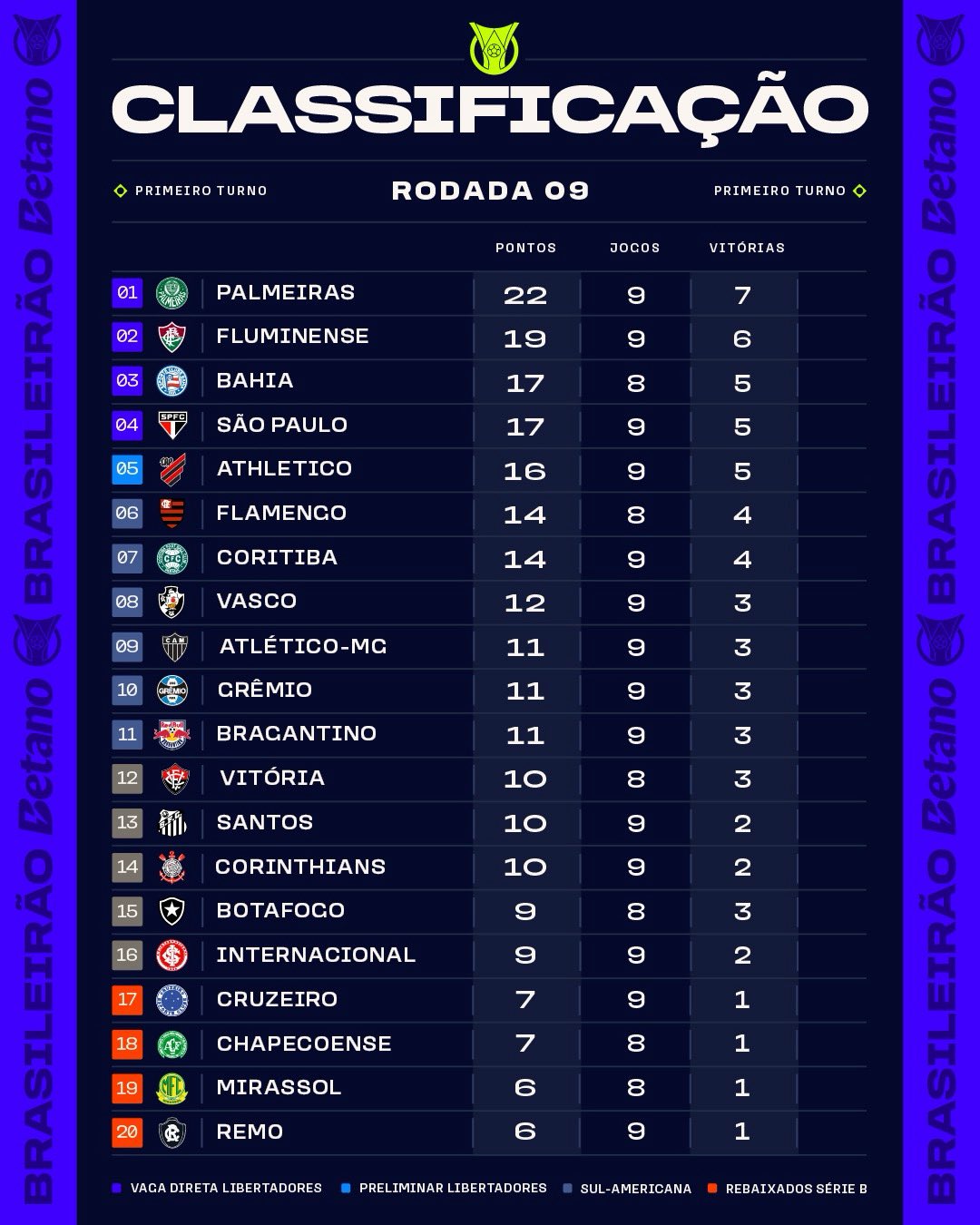 Terminada a 9ª rodada do Campeonato Brasileiro, o Vasco, que empatou com o Coritiba por 1 a 1, está na 8ª colocação.